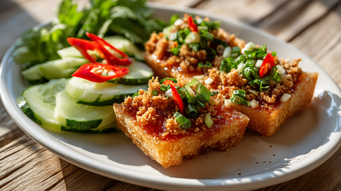🥢 Thailändische Vorspeise (Kanom Bang Na Gai)Knusprige, goldbraune Toasts mit würziger Fleischpaste und frischen Limettenblättern – ein echter Streetfood-Klassiker aus Bangkok.